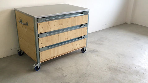 3 Schubladen quer auf Rollen und mit Aluminium Abdeckung.
